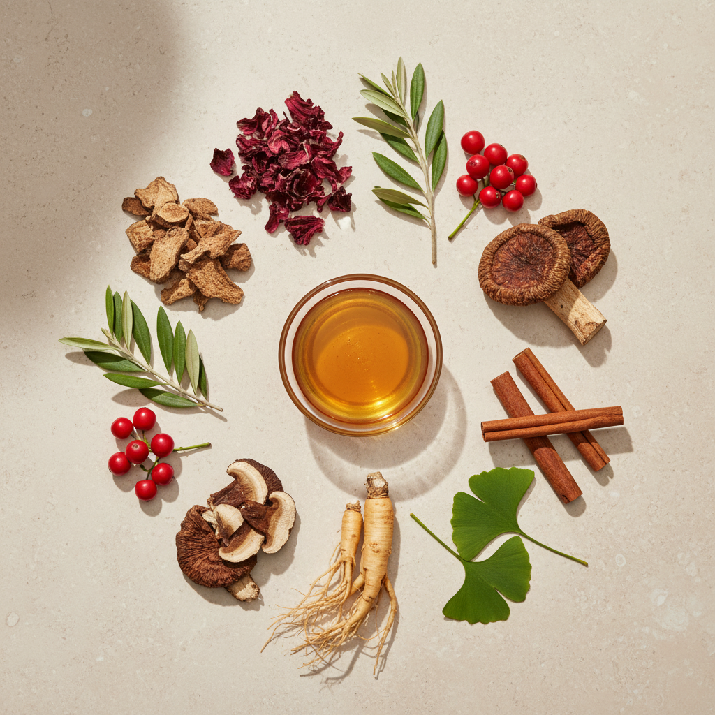 • Hawthorn berry, hibiscus, nettle leaf, Ceylon cinnamon, ginkgo biloba, and thyme – May support heart health by improving circulation, lowering blood pressure, and reducing inflammation.